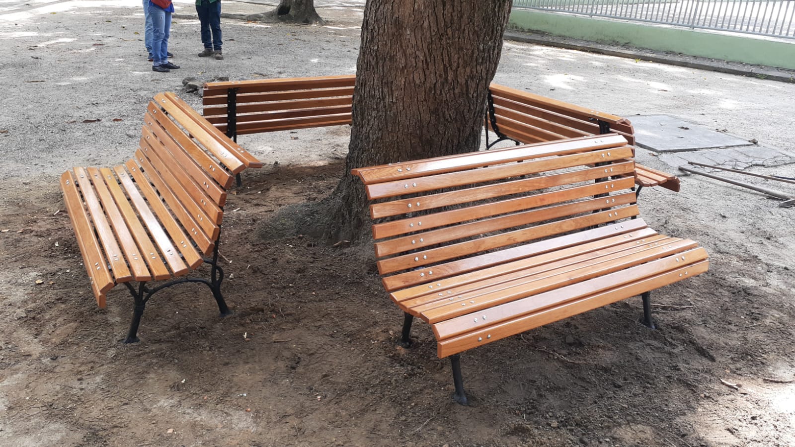 Os bancos são de madeira ipê, possuem 14 réguas e 1,60 metro de comprimento cada.