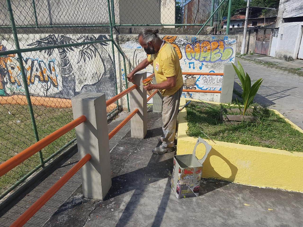 Pintura em bancos, canteiro e capina.