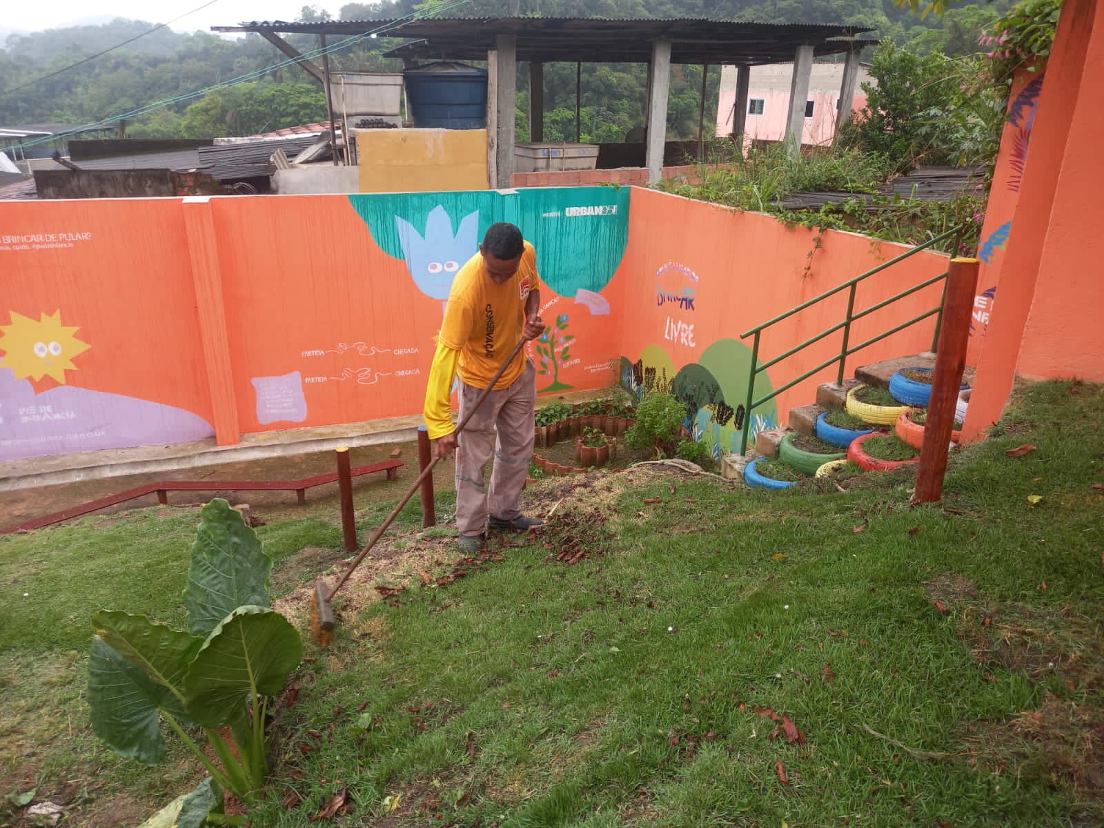 Limpeza, corte da grama , recuperação do paisagismo e pintura da praça .