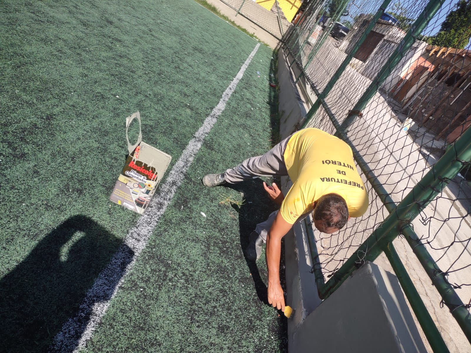 Limpeza e pintura do vestiário e da mureta do campo de futebol .