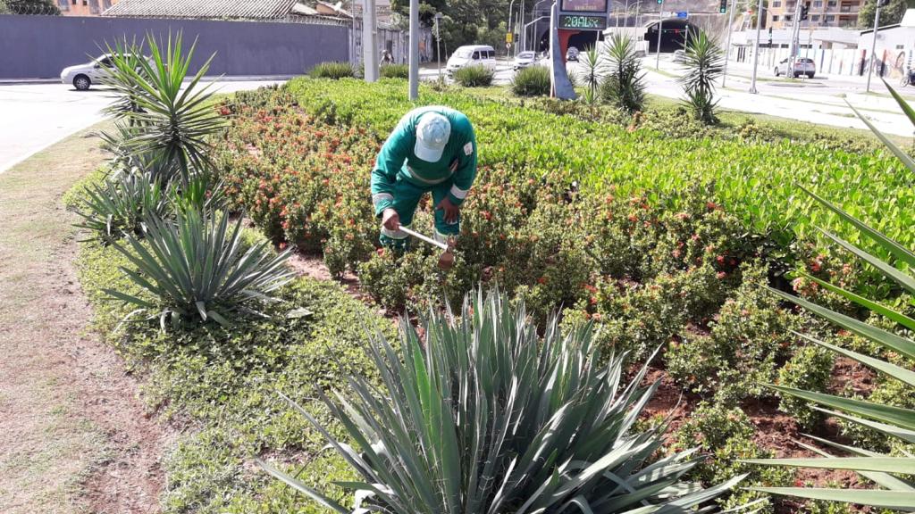 Equipes estão fazendo a manutenção dos canteiros jardinados na cidade.