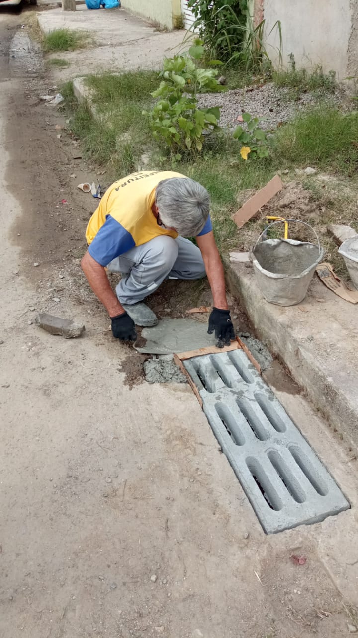 Troca de grelha de concreto quebrada por grelha de ferro fundido.