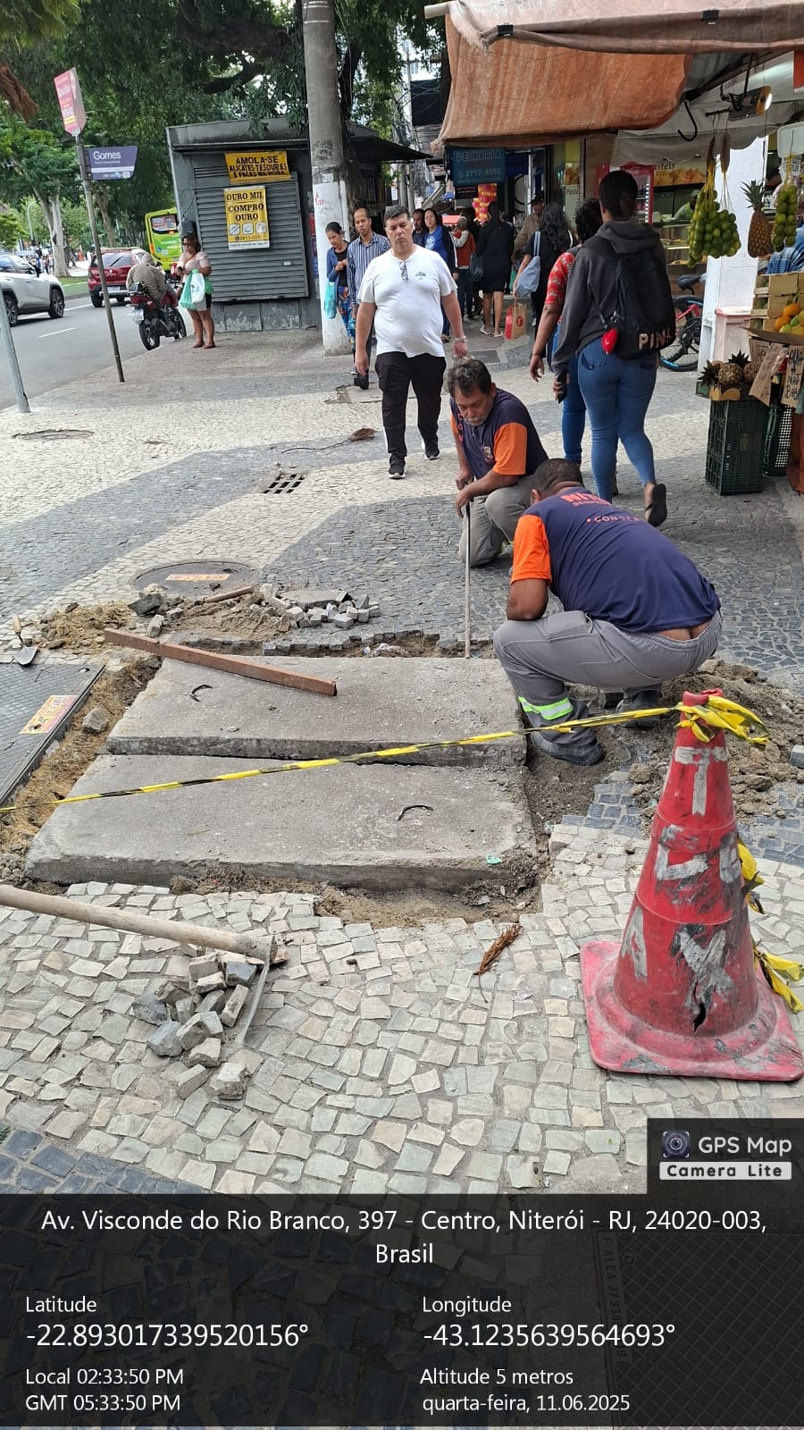 Equpe está  na Avenida Visconde do  Rio Branco com Cel. Gomes Machado - Centro realizando a  recuperação de calçada em pedra portuguesa.