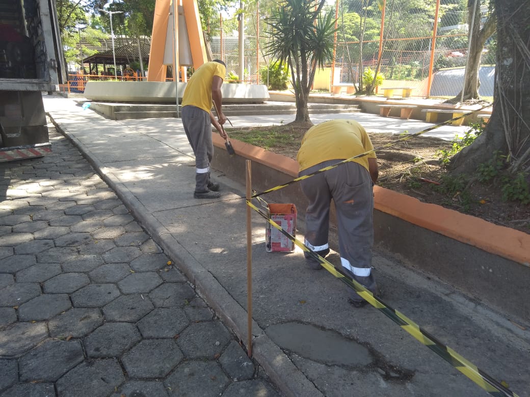 Finalização do serviço de reparo onde tinha um vazamento de água próximo do chafariz e pintura do trecho próximo do deck da praça .
