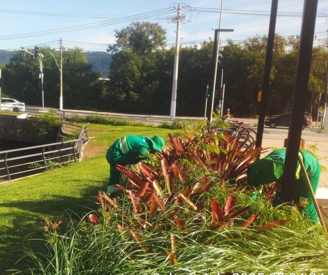 As equipes seguem cuidando dos canteiros jardinados da cidade.