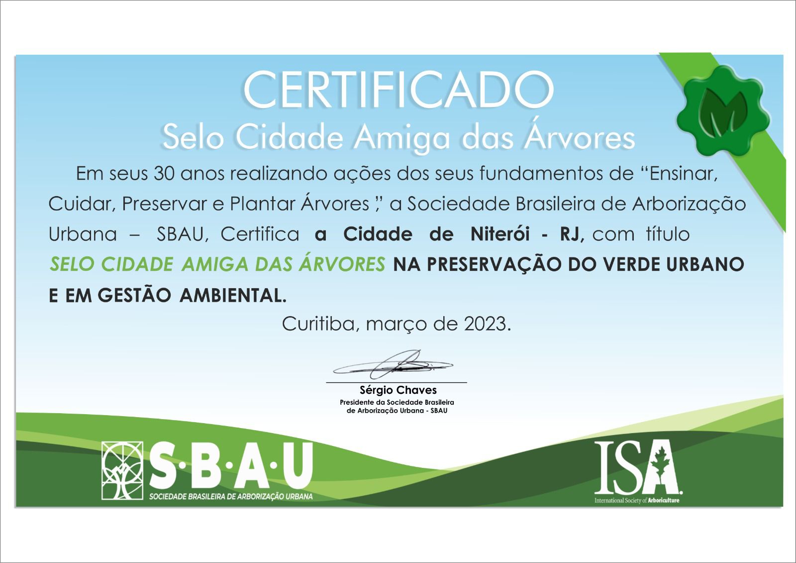 Niterói se tornou o segundo município brasileiro a receber o selo “Cidade Amiga das Árvores” oferecido pela Sociedade Brasileira de Arborização (SBAU). A cidade ganhou o prêmio por se destacar nos fundamentos das ações que a entidade ambiental preconiza para seus projetos de inclusão e reinclusão das árvores nas cidades. Desta forma, Niterói está contribuindo para avançar a arboricultura brasileira. A primeira cidade a receber o selo foi Campo Grande, capital do Mato Grosso do Sul.