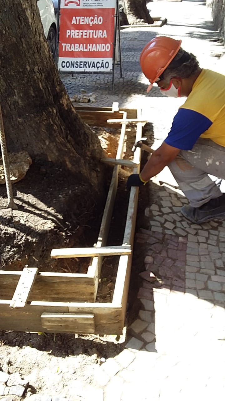 Recuperação da calçada de pedra portuguesa e da gola da árvore .
