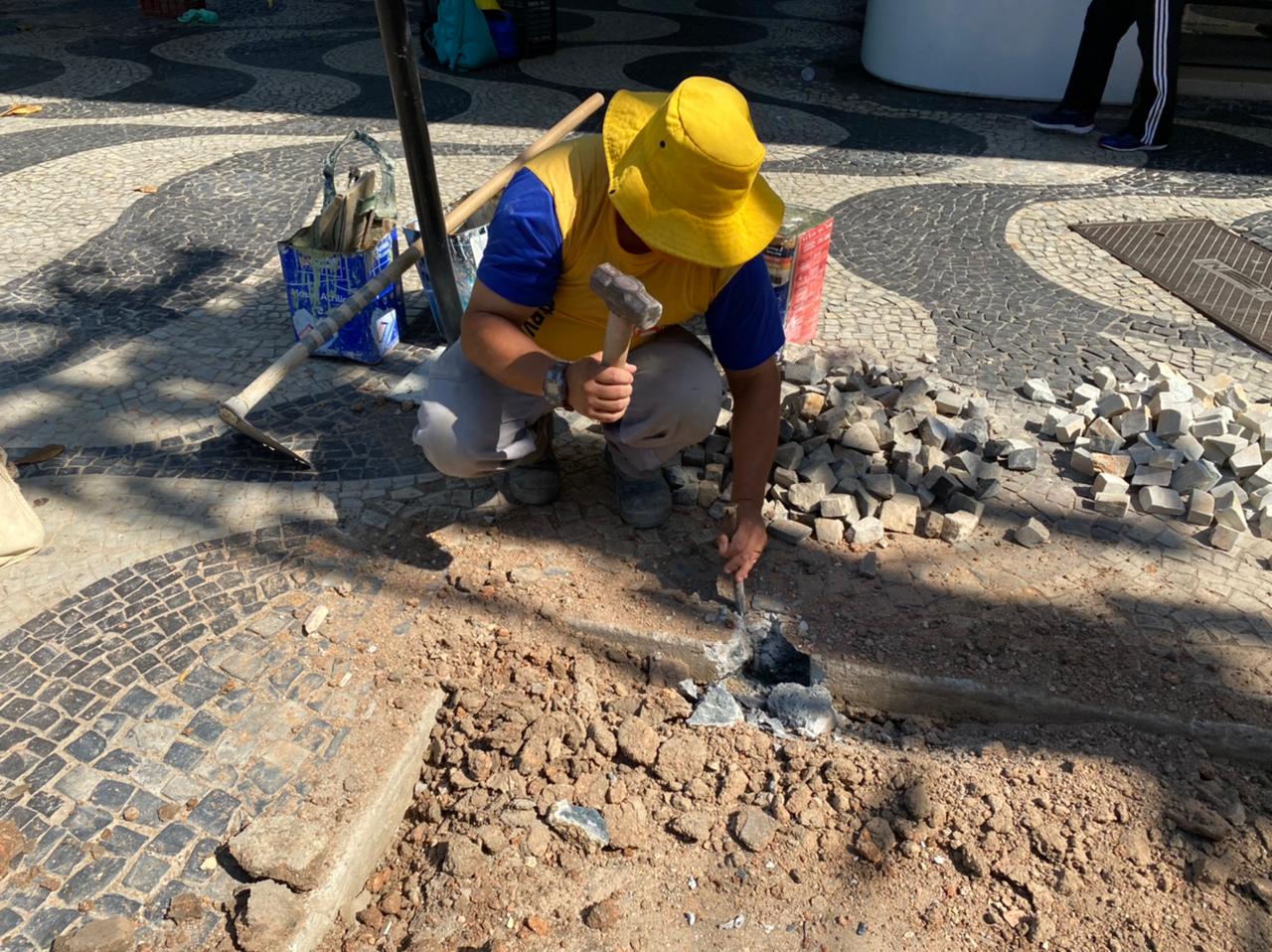 Recuperação de calcada com pedra portuguesa proveniente da remoção de banca de jornal.
