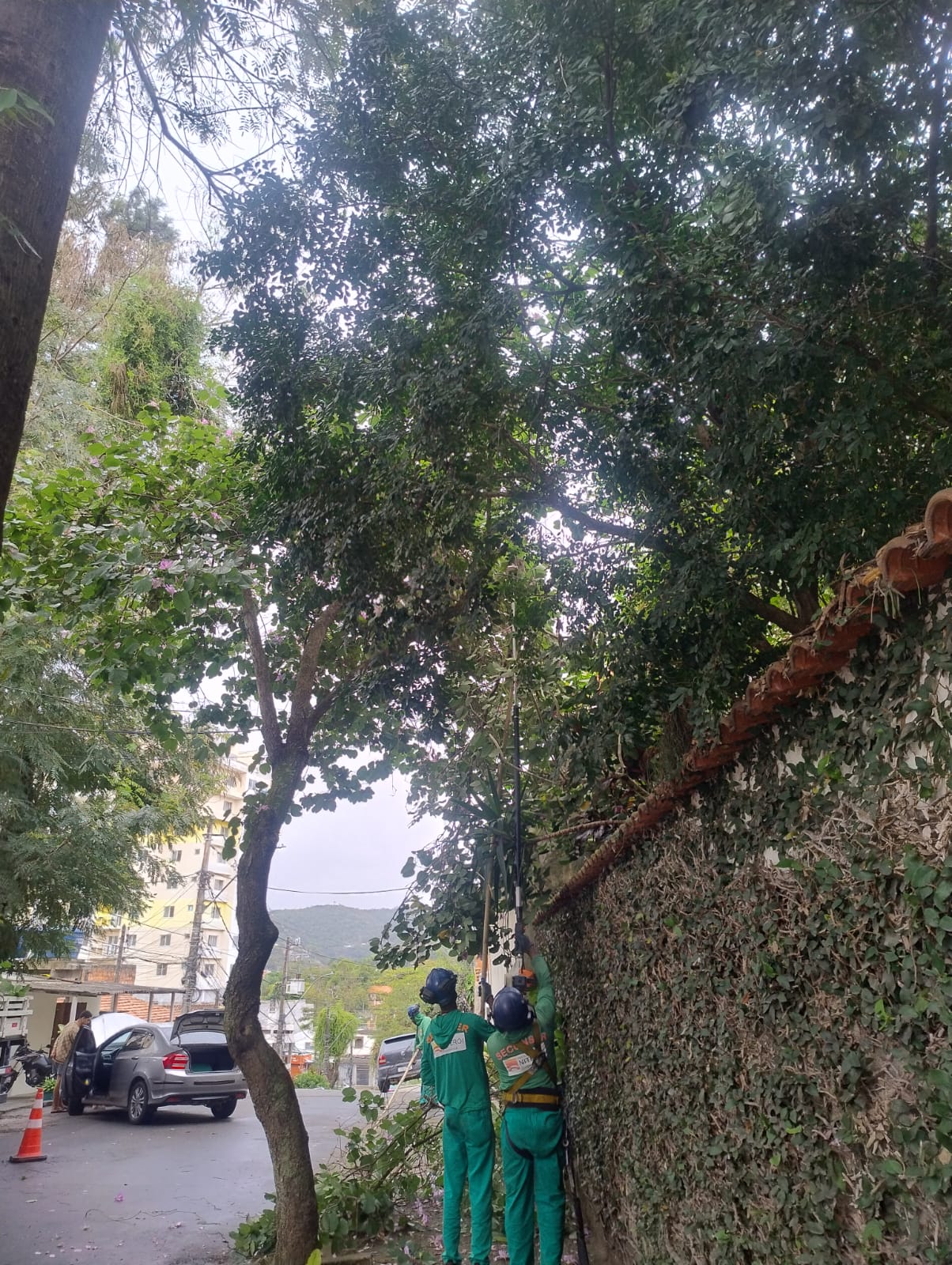 As equipes fazem podas em toda a extensão da Rua Bráulio Ralha, no Sapê. na Rua Santa Eugênia, no Largo da Batalha e também na Estrada da Fazendinha, no Badu.