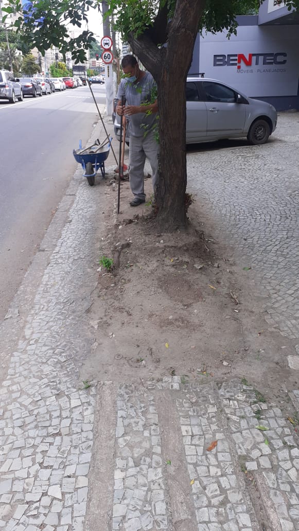 Foram executadas ontem (1/3) aa bertura de gola, adubação com NPK e colocação de hidrogel, plantio de resedá rosa e recomposição de calçada com piso de concreto simples e colocação de pedra portuguesa na Av. Roberto Silveira - lado oposto ao Campo de São Bento - Icarai: