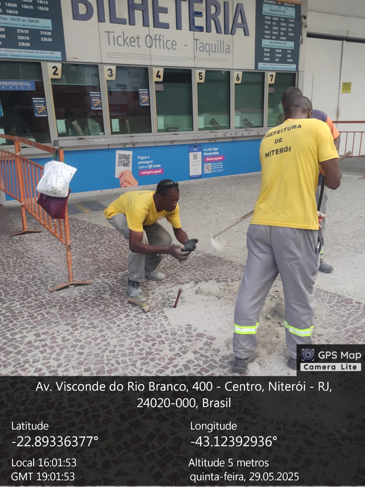 Equipe realiza recuperação de calçada com.pedra portuguesa na Praça Arariboia, no VmCentro.