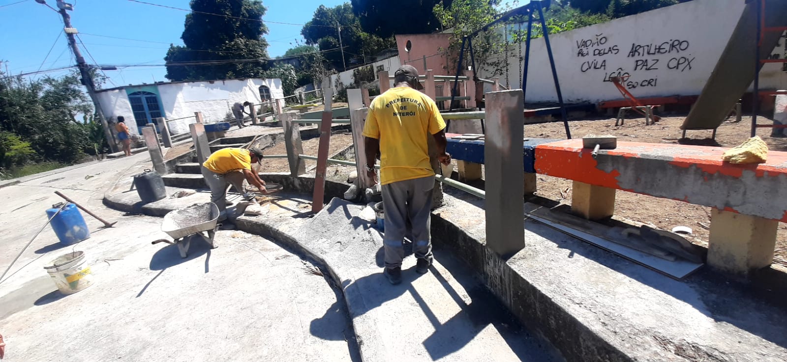 Limpeza ,pintura da mureta ,recuperação das telas do campo de futebol , instalação da porta do vestiário e reposição dos azulejos .