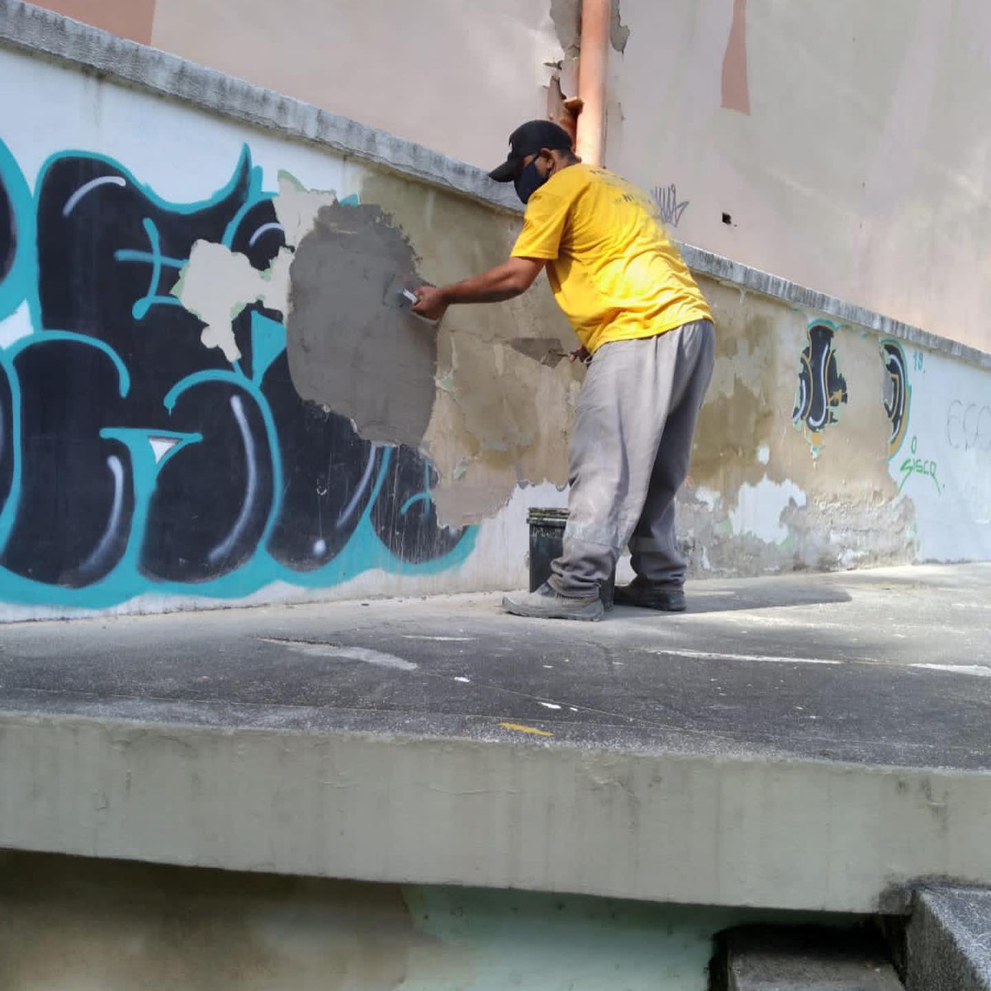 Está sendo feita a raspagem do trecho do muro que sofreu ação de vândalos para posterior pintura.
