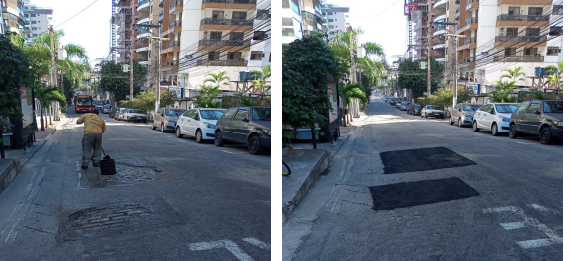 Seguem os serviços de tapa buraco, que foram realizados em diversos locais da cidade com massa quente (CBUQ), na última terça-feira (05/07/22) .