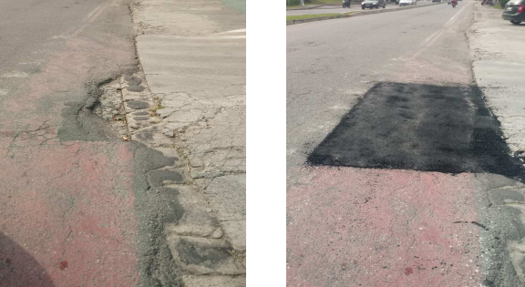 Seguem os serviços de tapa buraco , que foram realizados com massa quente ( CBUQ) , em diversos locais da cidade ontem (12/05/21).