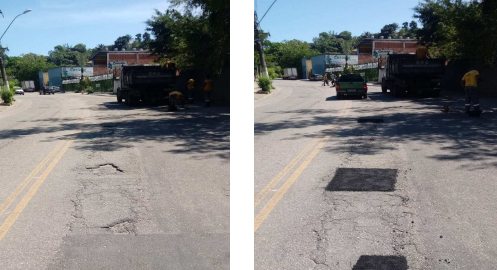 Seguem os serviços de tapa buraco , que foram realizados com massa quente ( CBUQ) , em diversos locais da cidade na terça-feira (23/11/21).