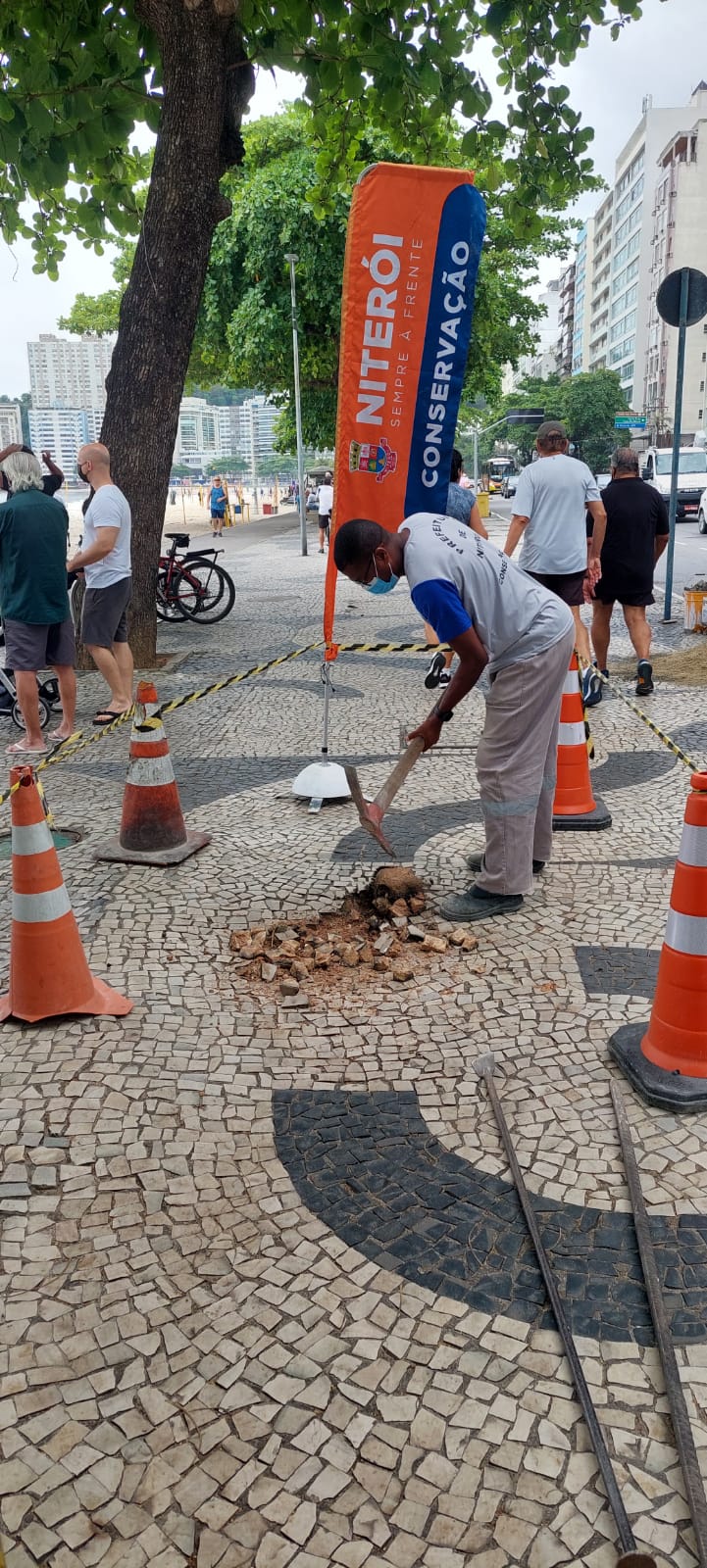 Recuperação de alguns pontos do calçadão com pedra portuguesa .