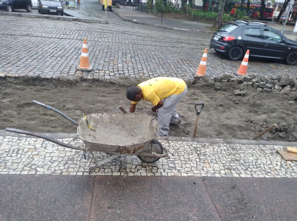 Recuperação de pavimento em paralelepípedo na ciclovia.